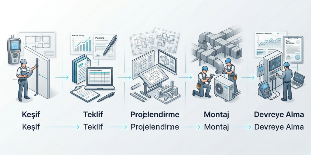 Projelendirme aşamasından keşif, mühendislik hesaplamaları, cihaz seçimi, montaj, devreye alma ve bakım süreçlerine kadar tüm adımları profesyonel olarak yönetiyoruz. Isıtma, soğutma, havalandırma ve merkezi klima sistemlerinde ihtiyaca özel çözümler sunarak, yüksek enerji verimliliği ve uzun ömürlü kullanım sağlıyoruz. Alanında uzman ekibimiz ile konut, ofis ve endüstriyel tesisler için eksiksiz ve sorunsuz çalışan sistemler kurarak, müşterilerimize zaman ve maliyet avantajı sunan anahtar teslim projeler gerçekleştiriyoruz.